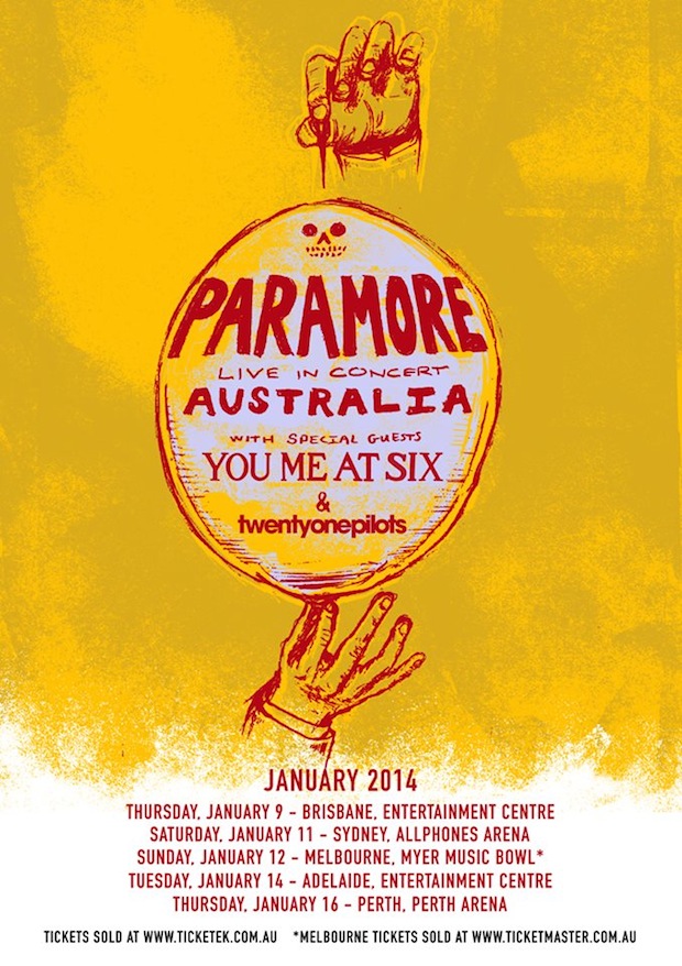 ParamoreはサポートにYou Me At Six、Twenty One Pilotsを迎え、オーストラリア・ヘッドライナー・ツアーを2014年1月に行うと発表しました。以下ツアーフライヤー、日程をチェック。