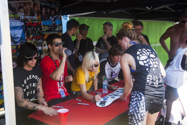 テントを出しているのはバンドだけではない。HopelessやFearless、No Sleepなど数多くのレーベルも出店しており、さらに日本でも人気のあるUSブランドGlamour Killsや、USでの展開を拡大し続けているインドネシアのブランドPeterSaysDenimなどのアパレル、もちろんVANS WARPED TOURというだけにVANSだって出店している。そして我らがAPのテントももちろんあり、今年はHopeless RecordsのサマーサンプラーをAPテント限定で配布していたり、毎日何組かのバンドのサイン会が開かれていて、バンドごとのサイン会だけでなく、APならではの豪華メンツによるサイン会も行われていた。下の写真はAPのWarped特集号の表紙を飾ったメンツによるサイン会と、読者投票によって選ばれたネクスト・ブレイク・バンドのサイン会の様子。